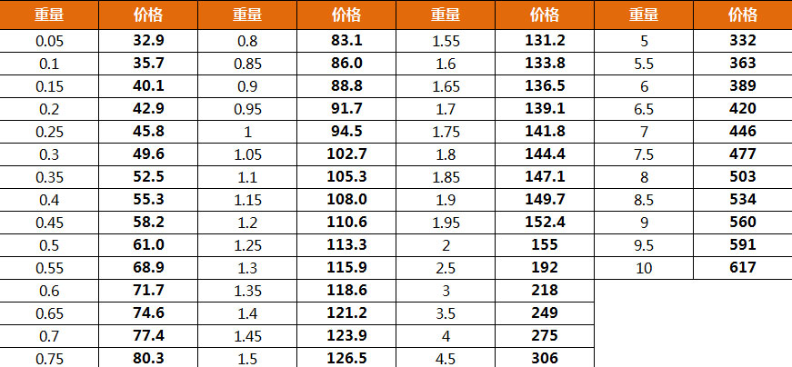 3)包裹退回加拿大倉庫后重新派送: 根據(jù)重寄貨物的重量不同,相應(yīng)收取重寄費(fèi)用,運(yùn)費(fèi)計(jì)算方式如下圖所示