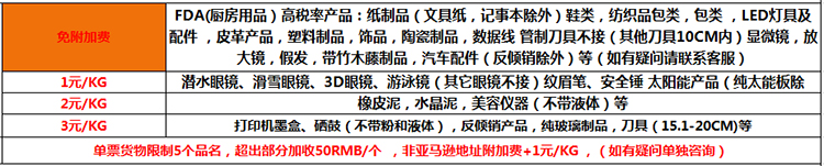 3.違禁品:護照身份證私人物品,打火機(包括USB打火機,)手機,對講機,移動電源,電子煙(指帶煙油的電子煙),彩印,硒鼓,墨盒,血壓計,安全錘,手推車,鋼釘,文具本,手表,鉛筆,折疊型金屬桌椅,仿牌,冒牌,侵權,純電池,危險品,液體,和木箱/鐵箱等包裝難以打開檢查的貨物,不規則貨物,非紙箱貨物。